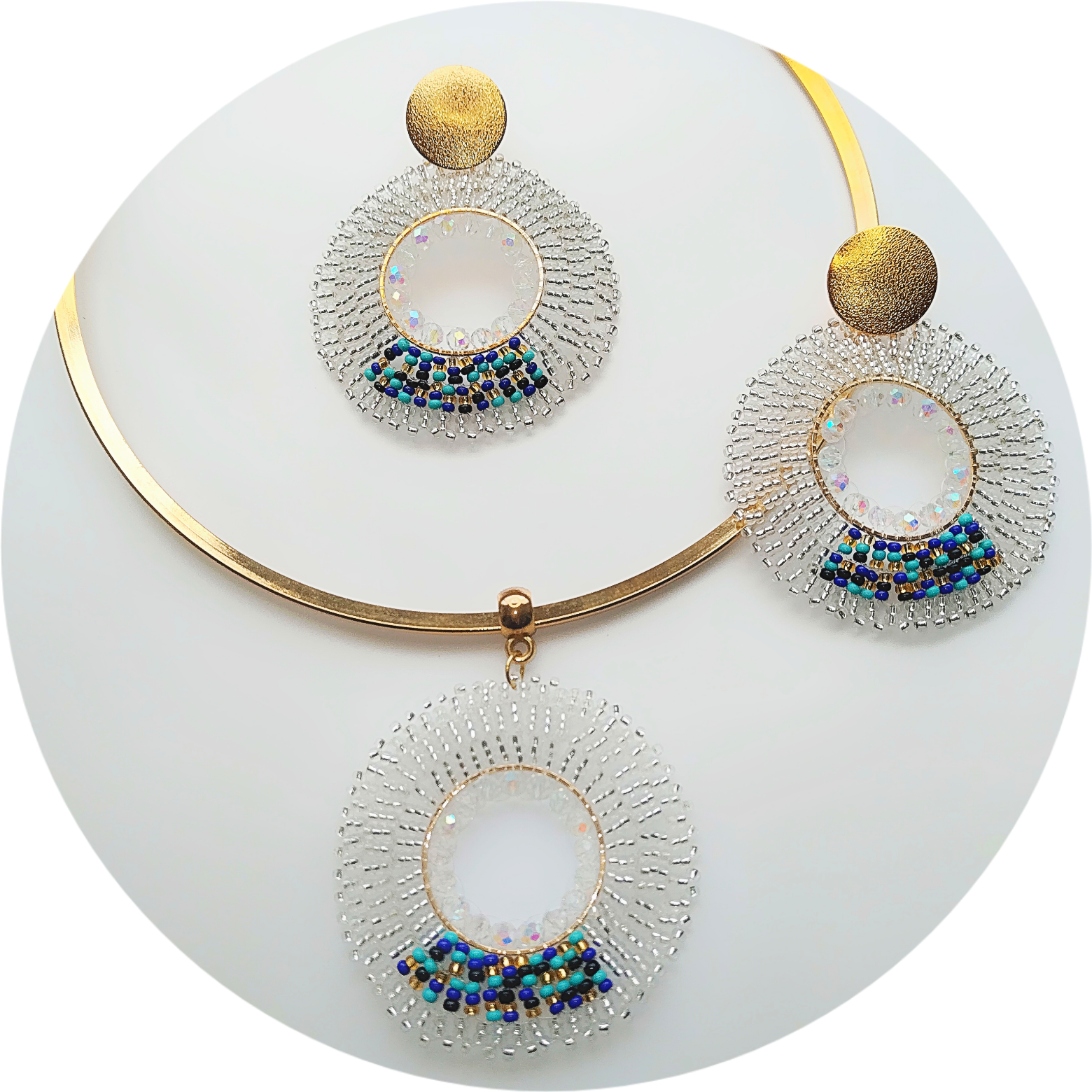 La combinación del bronce con baño de oro de 24k con las mostacillas crea un contraste perfecto entre lo clásico y lo moderno. La elegancia del baño de oro se complementa con la vivacidad de las mostacillas, haciendo que el set sea perfecto tanto para ocasiones formales como informales.