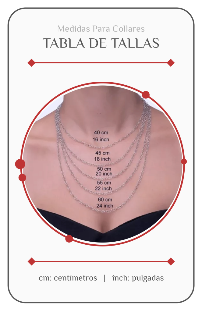 Estas medidas son aproximadas y pueden variar según el diseño del collar y la complexión de la persona. Al elegir un collar, es importante considerar la longitud deseada y cómo se ajustará al estilo y la forma del cuerpo.